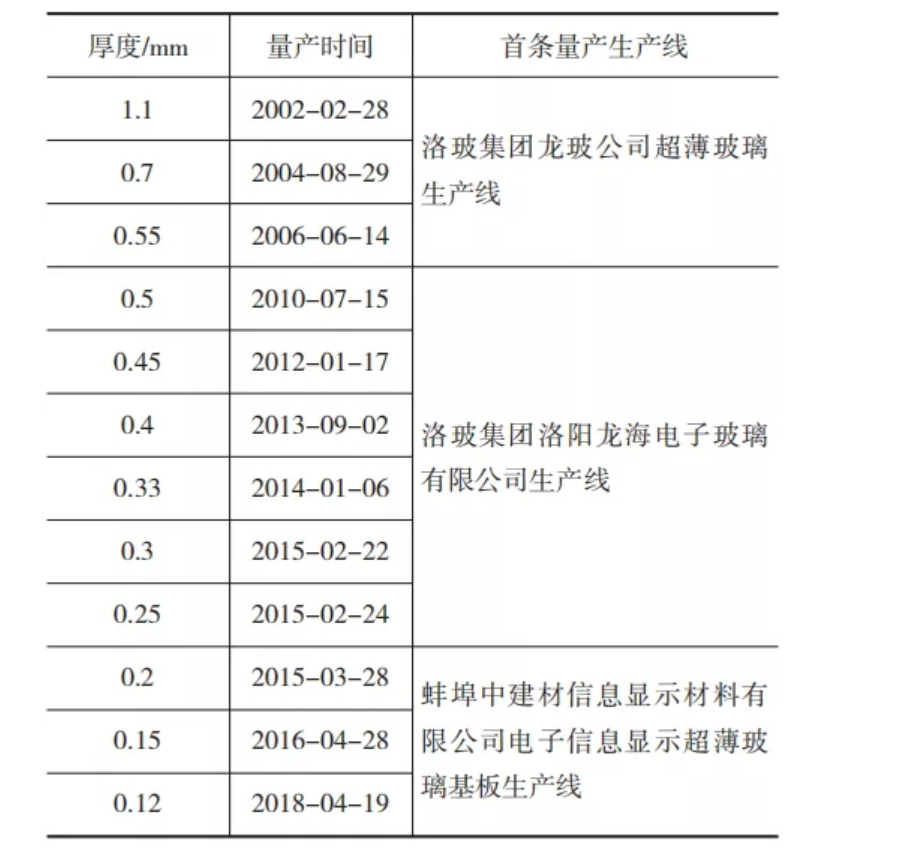 2001年9月,中国首条超薄浮法玻璃生产线在洛玻龙门玻璃公司点火投产,相继生产出了1.1、0.7 mm的超薄浮法玻璃。2006年1月,洛玻集团洛阳龙海电子玻璃有限公司第二代提高型STN级电子玻璃生产线建成投产,分别于2010年7月组织生产0.55 mm超薄玻璃,2012年1月,成功生产出0.45 mmSTN级超薄玻璃产品;2014年1月,成功研制出0.33 mm超薄电子玻璃;2015年3月,研制出0.25 mm电子玻璃。洛玻全资子公司埠中建材信息显示材料有限公司分别于2015年3月成功拉引出0.2 mm超浮法电子玻璃;2016年4月,0.15 mm超薄浮法电子玻璃下线,2018年4月,0.12 mm超薄浮法电子玻璃下线,创造了浮法技术工业化生产的世界最薄玻璃纪录,成为目前国内唯一具备生产0.12 ~ 1.1 mm全系列超薄浮法电子玻璃能力的高科技企业。2019年4月28日,洛玻集团洛阳龙海电子玻璃有限公司第三代信息显示超薄基板玻璃生产线成功点火,该生产线在智能化、绿色化、高端化方面多项指标达到国际先进或领先水平