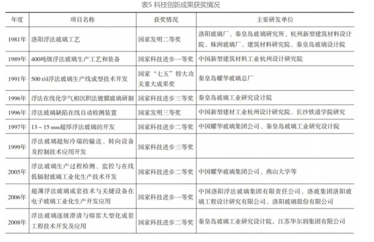 浮法玻璃行业在国家级企业技术中心、工程技术中心及国家重点实验室的带动下,研发出一大批引导行业发展的科技成果,也获得了国家等各级别的科技奖励。浮法玻璃科技创新成果获奖情况见表5.
