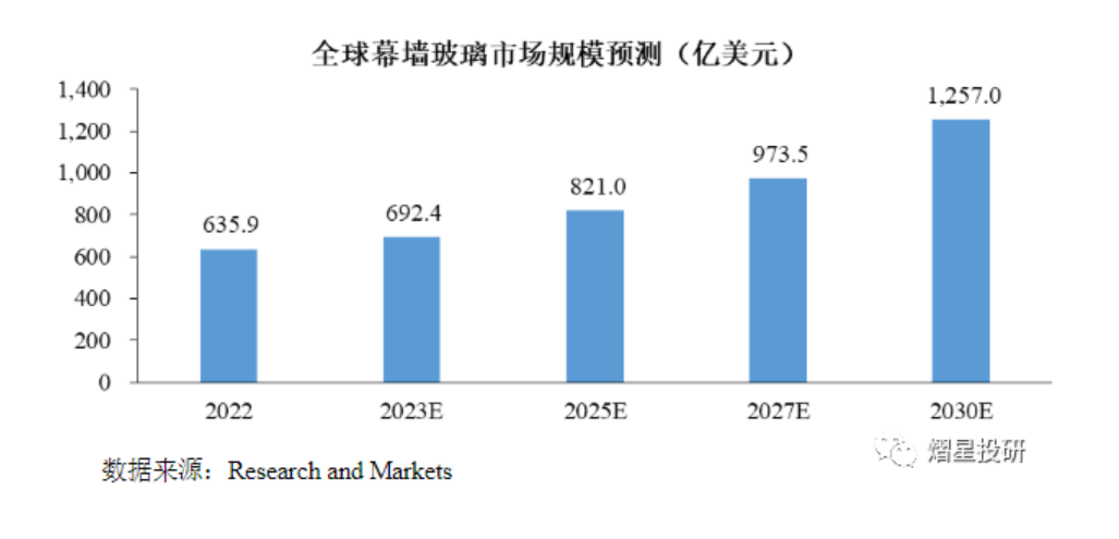 在建筑理念不断升级、环保理念持续深化等因素驱动下,下游客户对幕墙玻璃的造型外观、环保性能、品质及配置等要求进一步提高,以钢化、中空、夹层、低辐射镀膜或丝网印彩釉等多种工艺加工而成的高附加值幕墙玻璃市场需求不断增长。根据市场调研机构 Research and Markets 的数据,2022 年全球幕墙玻璃市场规模约为 635.9 亿美元,预计到 2030 年将达 1,257.0 亿美元,2022 年至 2030年全球幕墙玻璃市场规模的年均复合增长率约 8.89%,呈较快增长趋势,市场空间广阔。