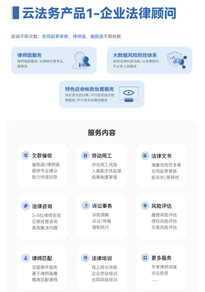 法律服务产品化:更细分、更专业、更标准、更透明!法律服务行业的变革。以客户需求为中心,将无形化的法律服务模块化、流程化、可视化。